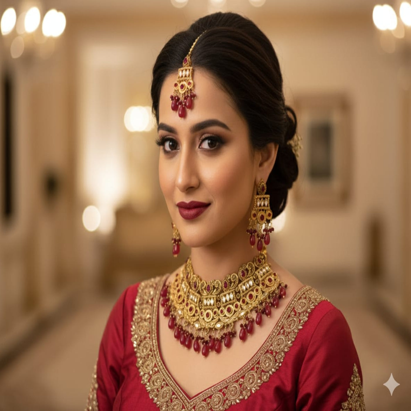 Elevate your bridal ensemble with this exquisite red and golden necklace set, meticulously crafted to complement traditional wedding attire. Each piece features delicate detailing that captures light beautifully, creating an elegant focal point for your special day. The harmonious blend of rich red tones with lustrous gold accents reflects timeless sophistication and cultural elegance. Perfect for brides seeking jewelry that balances ornate craftsmanship with refined grace, this set delivers the luxury and prestige your bridal look deserves.