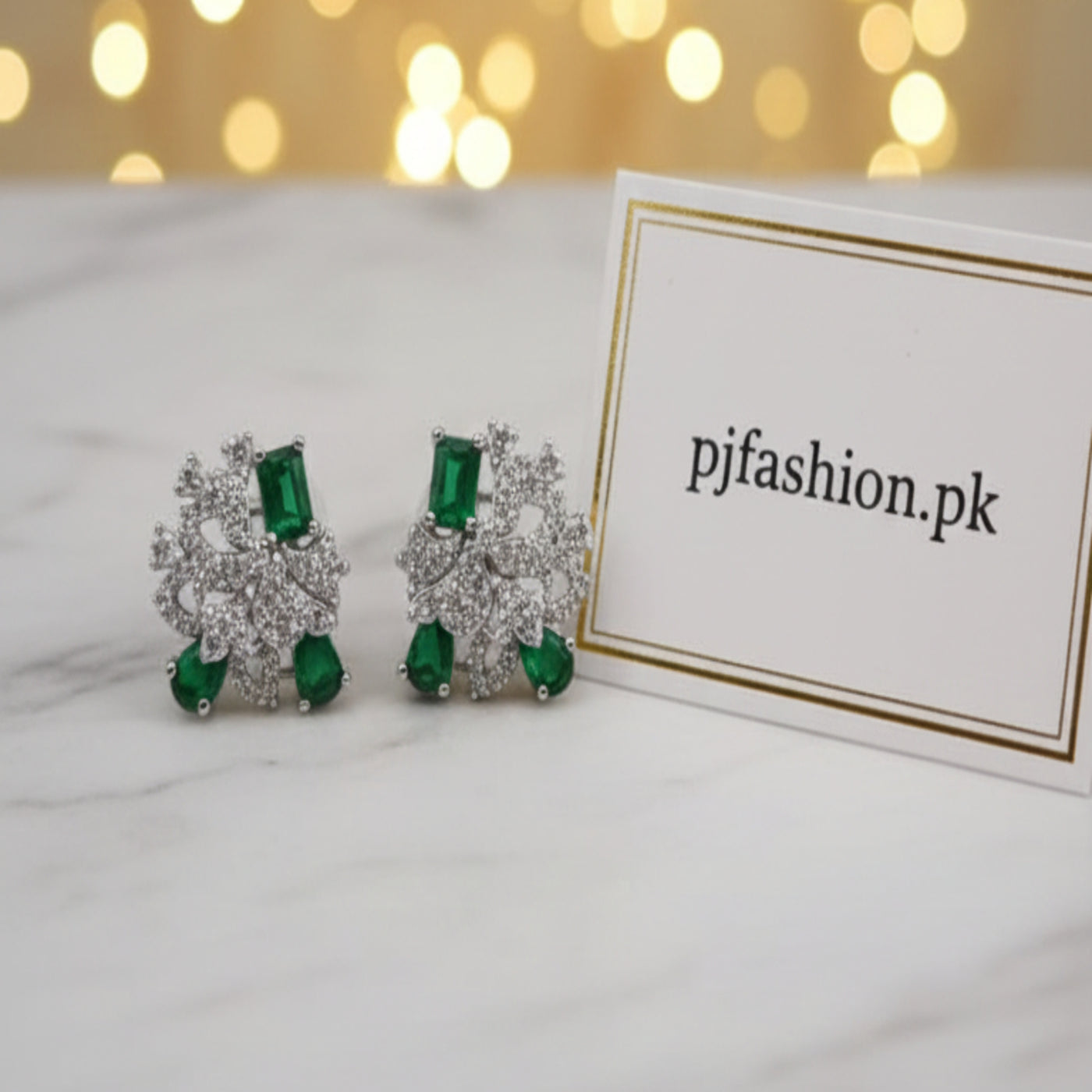Leaf-Motif Zirconia Earrings with Vibrant Emerald (FSE215)