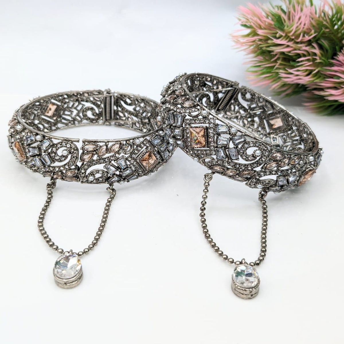 Bring a touch of ethnic charm to your style with our Silver Oxidised Kara Bangle. Adorned with vibrant colored stones, this bangle blends traditional craftsmanship with a bold, artistic flair. Its intricate oxidised detailing makes it a perfect statement piece for festive occasions, cultural events, or adding a unique twist to your everyday outfits from pjfashion.pk