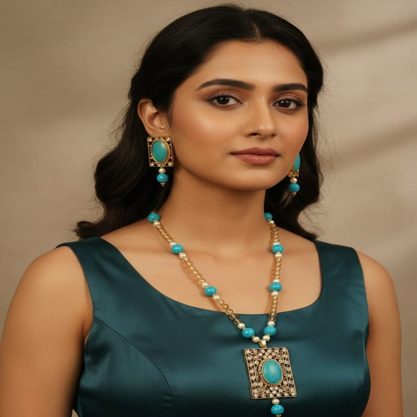 Elevate your spiritual practice with this exquisite Aqua Fancy Maala Locket, meticulously crafted by PJ Fashion. Featuring genuine aqua stone beads paired with lustrous golden accents, this maala combines traditional elegance with contemporary design. The integrated locket serves as a meaningful focal point for meditation and prayer, while the premium materials ensure lasting durability. Perfect for daily wear or special occasions, this piece reflects both devotion and refined taste. An ideal choice for those seeking authentic craftsmanship and timeless beauty in their spiritual accessories.
