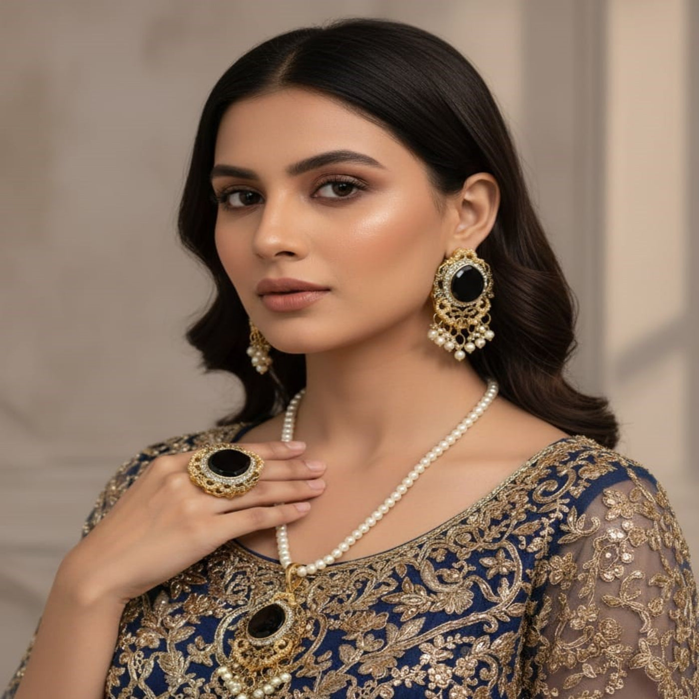 Elevate your traditional ensemble with this exquisite Black Stone Pearl Maala Locket, meticulously crafted to blend timeless elegance with contemporary sophistication. Featuring lustrous pearls paired with striking black stone accents, this piece delivers a refined aesthetic perfect for both ceremonial occasions and everyday wear. The locket design adds a personal touch, allowing you to carry cherished moments close. Expertly finished for durability and lasting brilliance, this maala set embodies the craftsmanship PJ Fashion is known for, making it an essential addition to your jewelry collection.