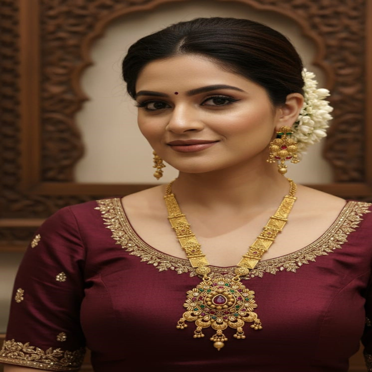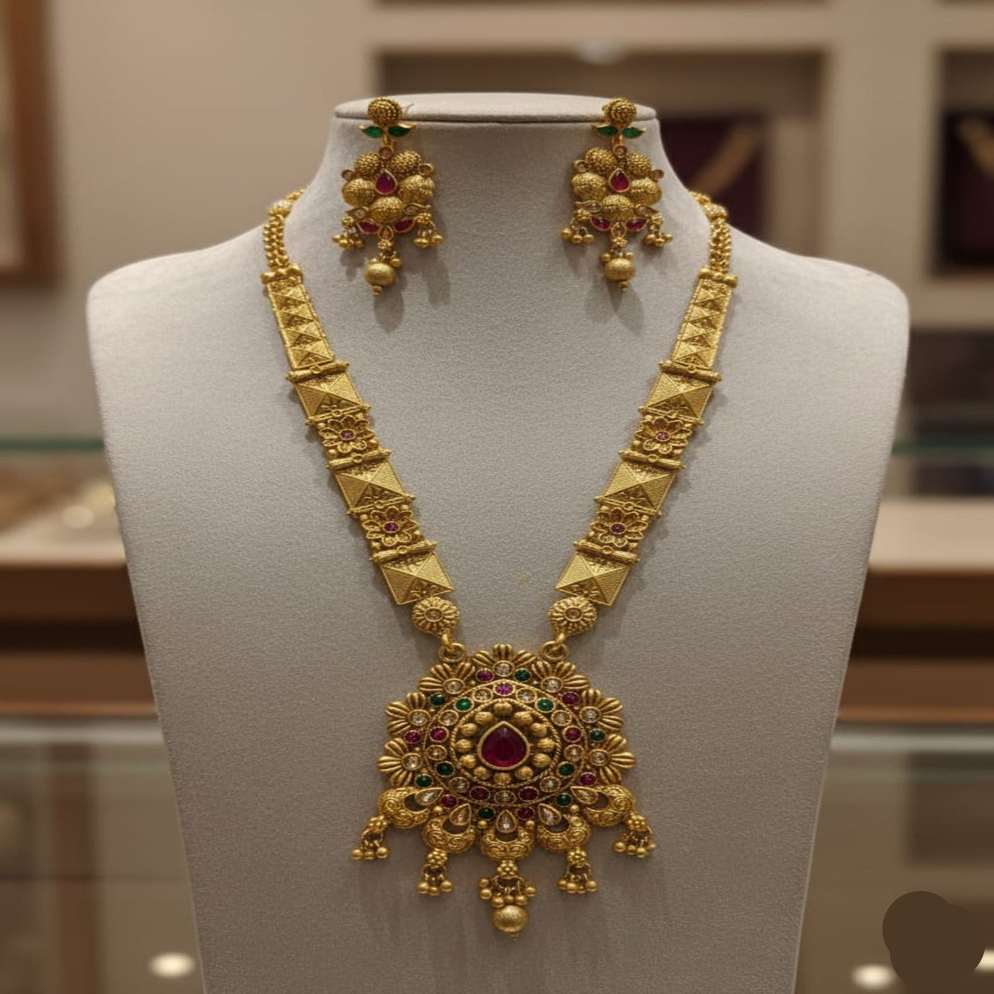 Rajwari Stylish Maala Set (FDM113) combines traditional craftsmanship with timeless elegance. This exquisite multi-stone jewelry piece features intricate wirework detailing and an authentic antique finish that captures the essence of classic Pakistani jewelry design. Perfect for weddings, festivals, and special occasions, each stone is carefully set to create a sophisticated, layered look. The antique patina adds depth and character, making this maala set a versatile addition to both traditional and contemporary ethnic wear. Handcrafted with attention to detail, it's a statement piece that celebrates heritage and artistry.