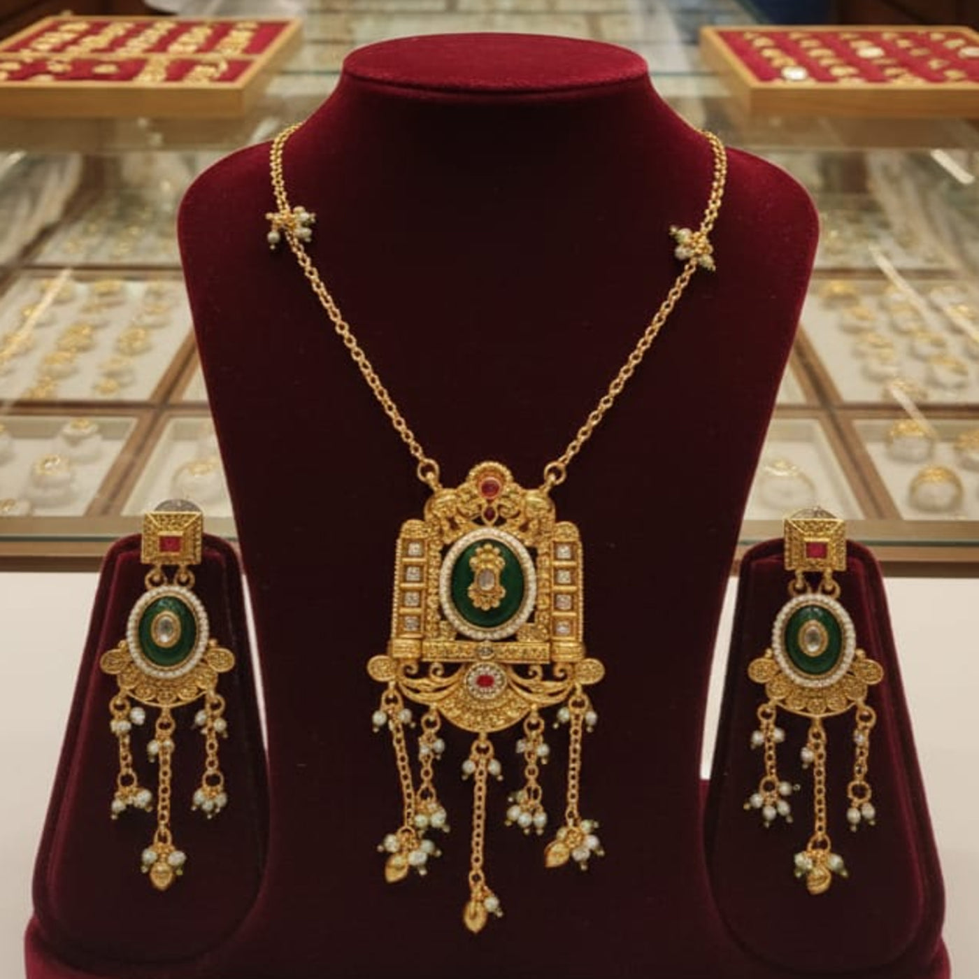 Elevate your traditional ensemble with this exquisite Rajwari Maala Set, a masterpiece of timeless elegance. Adorned with lustrous green stones that catch the light beautifully, this ornamental necklace combines classic craftsmanship with sophisticated design. Perfect for weddings, festivals, and special occasions, the intricate detailing showcases authentic jewelry artistry. The verdant gemstones add a regal touch to any traditional or contemporary outfit, making this set an essential addition to your jewelry collection. Crafted with precision and attention to detail, it's a statement piece that speaks to refined taste and cultural heritage.
