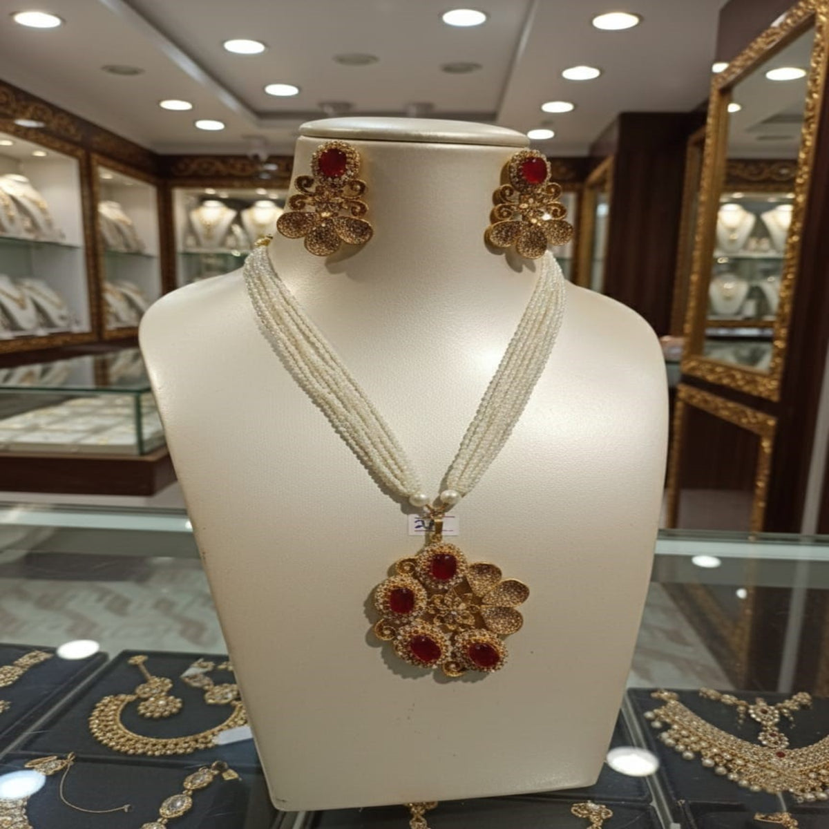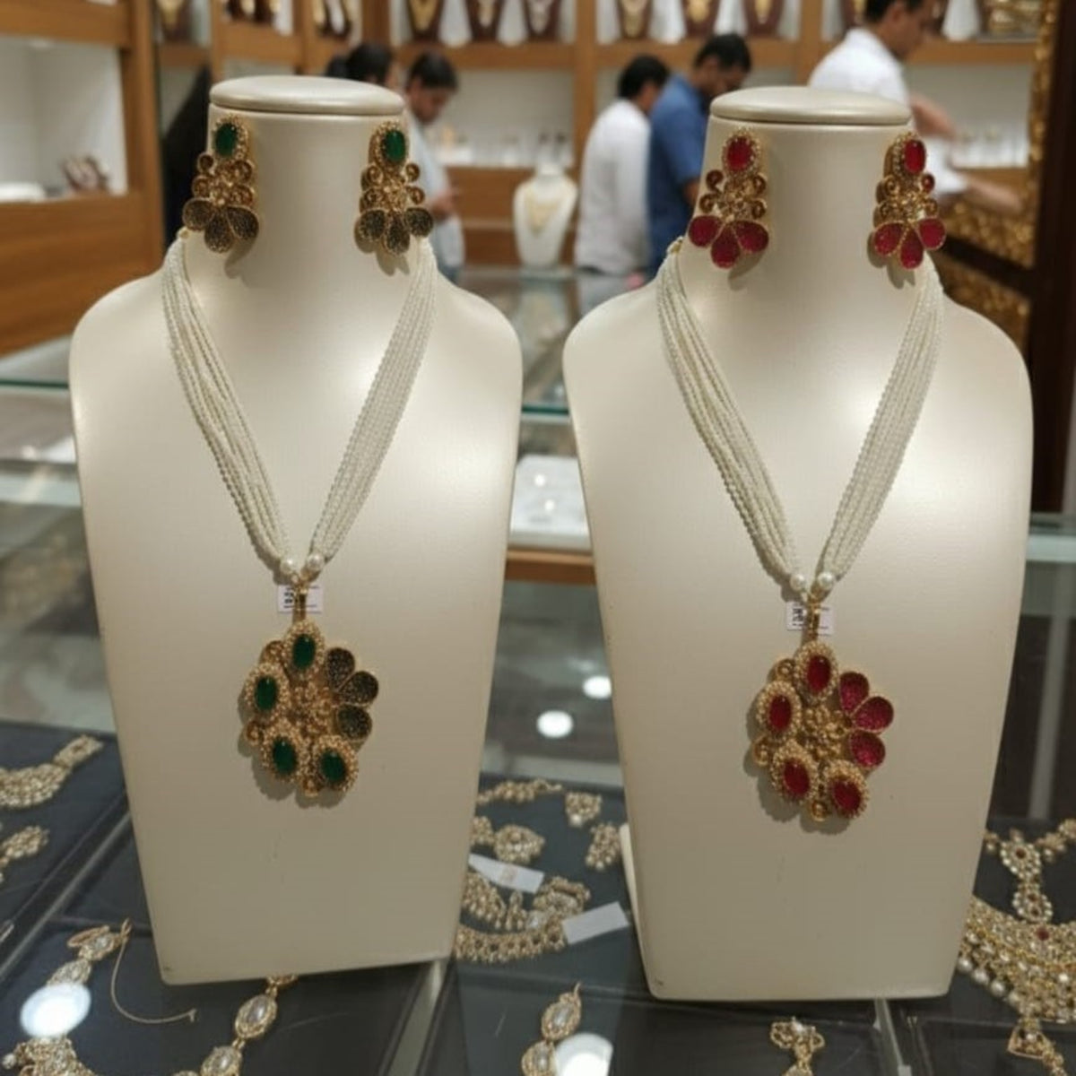 Elegance meets heritage in this stunning multi-strand seed pearl mala. The necklace features a large, handcrafted floral pendant in antique gold, available with either rich emerald-green or ruby-red stone embellishments. Accented with shimmering zircons, this long-form necklace is a timeless choice for festive and formal occasions.