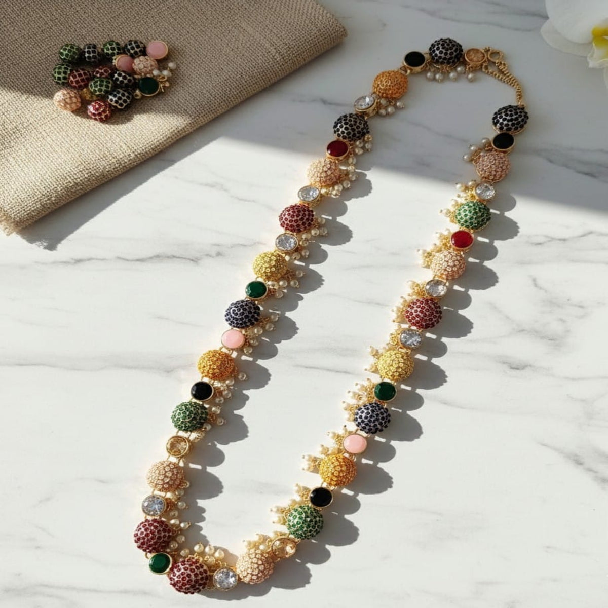 This Elegant Multi Maala from pjfashion.pk showcases a refined blend of colored stones and pearls, expertly arranged to elevate any traditional outfit. Its layered design offers depth and sophistication, making it a versatile accessory for special occasions. Crafted with attention to detail, this piece embodies timeless elegance and enhances your ensemble with a subtle yet striking charm.