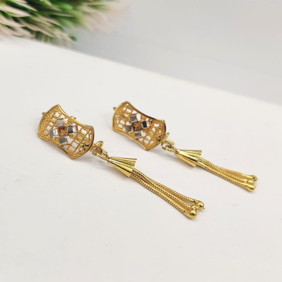 These RP Gold Fancy Earrings from PJ Fashion blend intricate craftsmanship with timeless elegance. Designed for a sophisticated look, they add a refined touch to any outfit. Perfect for special occasions or enhancing everyday style, these earrings offer a luxurious finish that complements a variety of ensembles with expert precision.