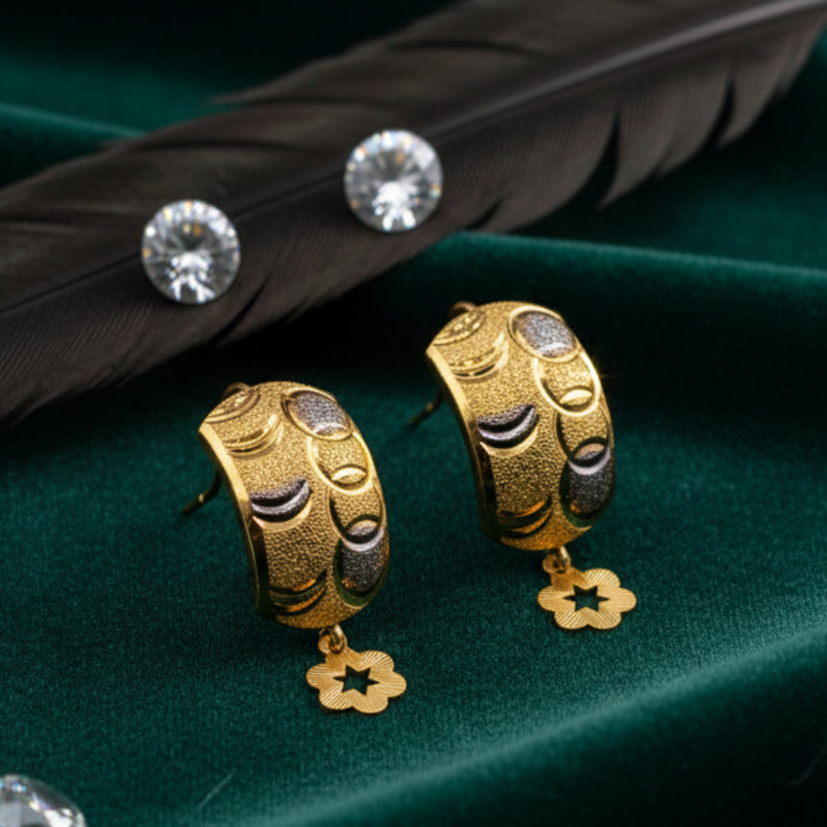 Elevate your everyday "ear game" with the exquisite artistry of our Calibrate-Texture Hoops. These are not your average gold hoops; they feature a unique, micro-etched concentric circle pattern that catches and reflects light from every angle, creating a multi-dimensional sparkle. Each hoop is elegantly finished with a playful, laser-cut star-flower charm that dances with your movement, adding a youthful energy to the sophisticated design.
