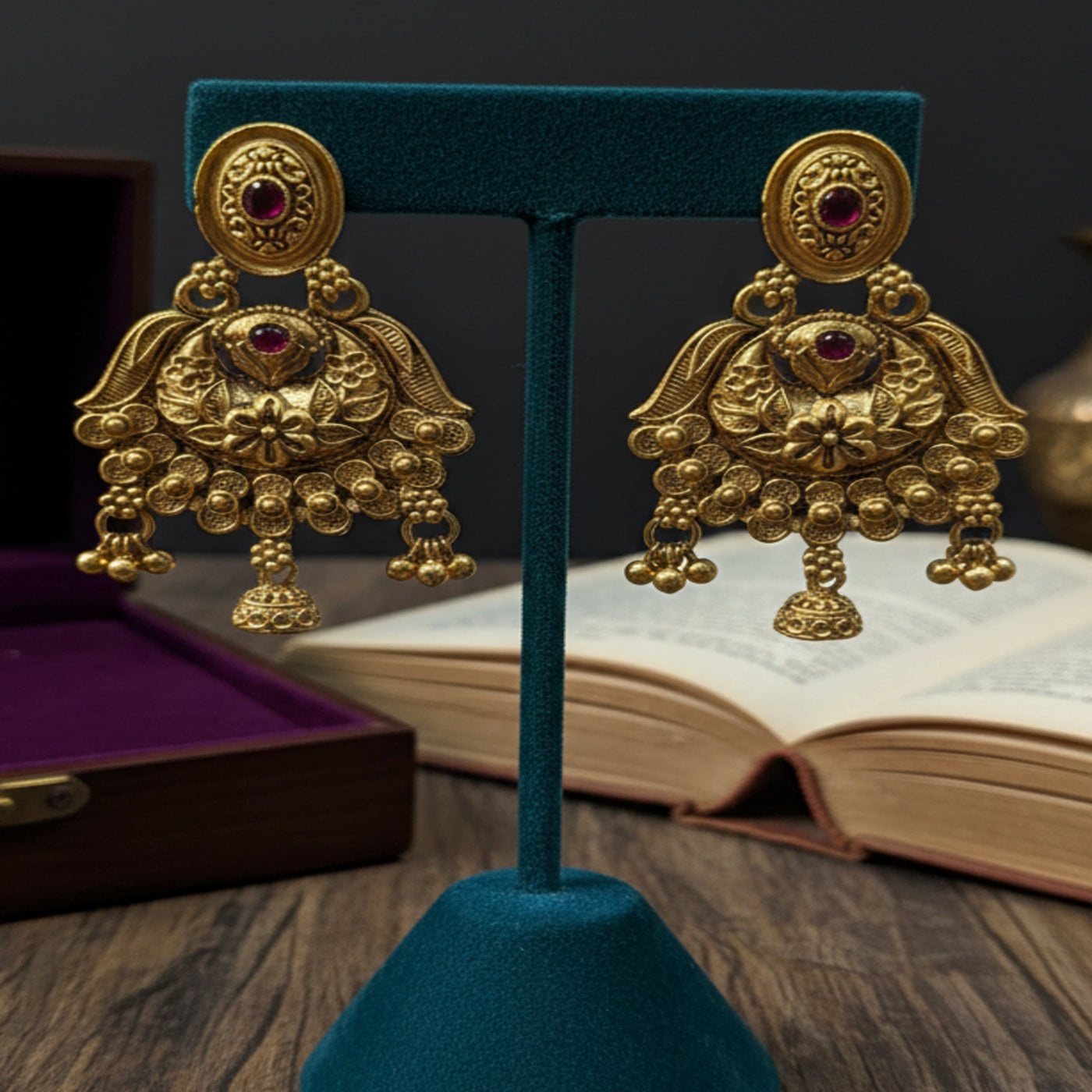 These avant-garde earrings are a blend of nature and high fashion. Featuring multi-layered golden flowers and encrusted with clusters of emerald or ruby-colored crystals, they are finished with large, organically shaped baroque pearls.