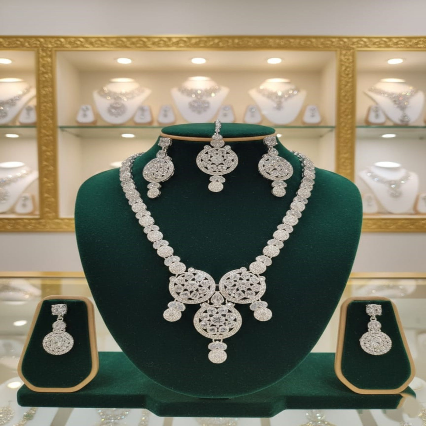 Set Composition: 1 x Geometric Circular Statement Necklace, 1 x Matching Maang Teeka, and 1 x Pair of Round Crystal Drop Earrings.