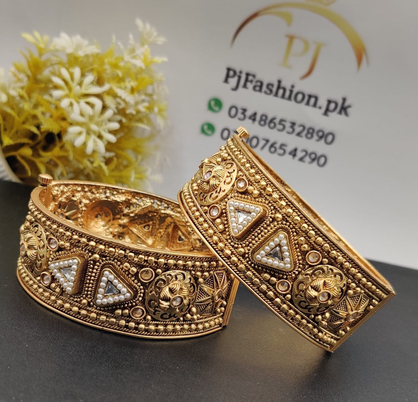 Redefine your ethnic style with these one-of-a-kind Statement Kadas that blend geometric precision with vintage charm. Each bangle features a series of unique Triangular Inlays, meticulously filled with micro-seed pearls and framed by a rich antique gold texture. The contrast between the matte golden base and the soft white luster of the pearls creates a sophisticated, high-fashion aesthetic that stands out from traditional designs.