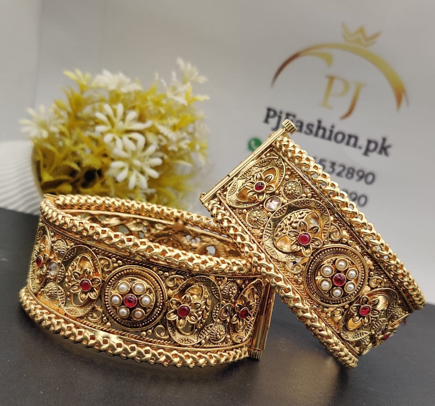 Add a touch of timeless grace to your ensemble with these beautifully detailed Floral Bloom Kadas. Each piece showcases a series of embossed golden florets, uniquely centered with soft white pearls and vibrant ruby-red stones. The intricate mesh-work background and the signature braided-rope borders give these bangles a rich, textured feel that perfectly captures the essence of traditional heirloom jewelry.