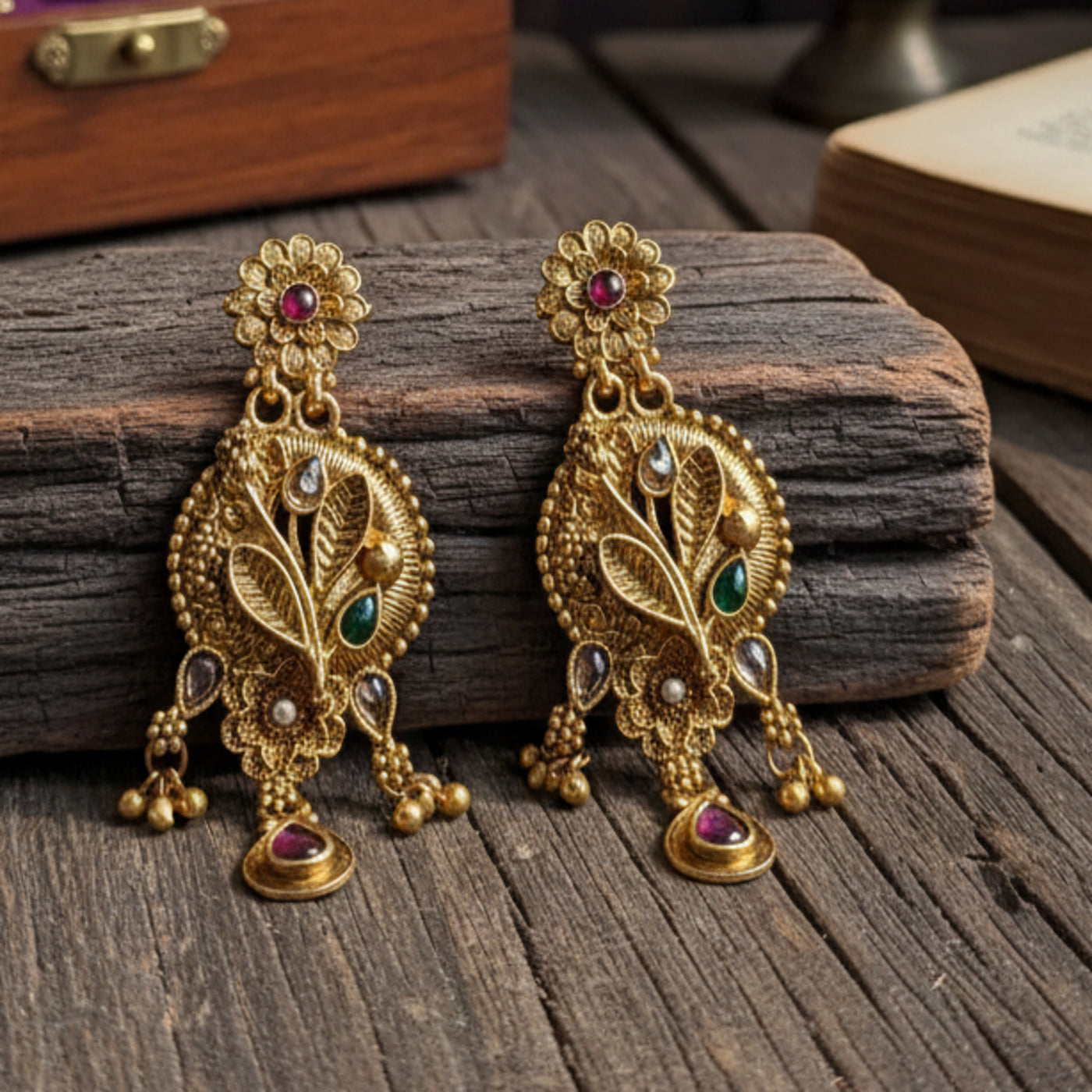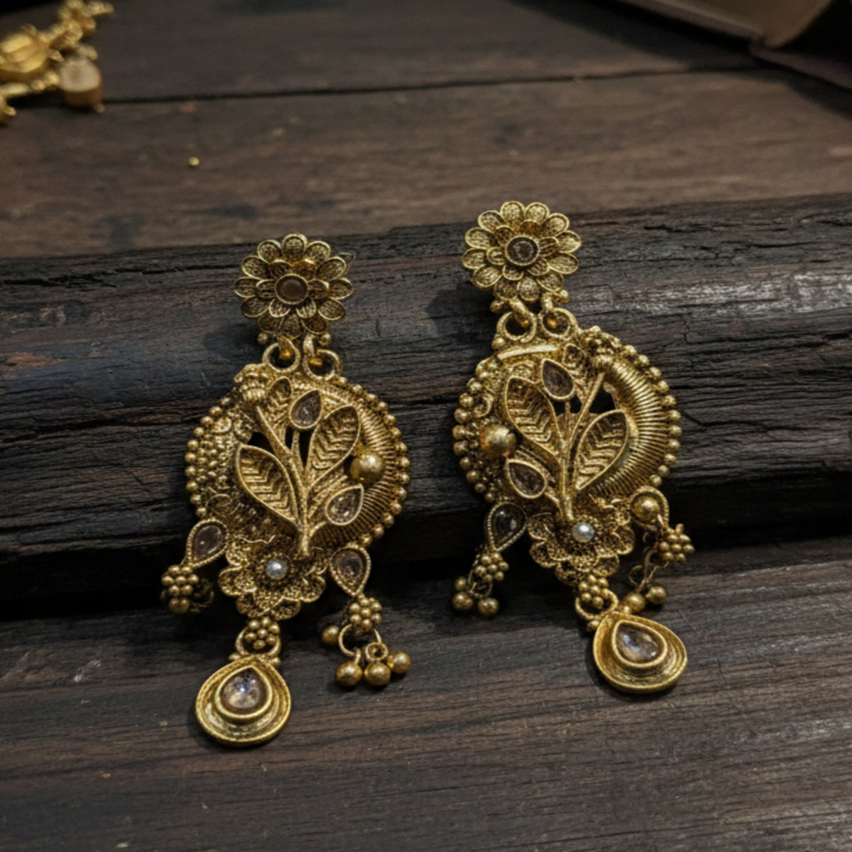 Embrace timeless elegance with these traditional leaf-inspired drop earrings. Crafted with a warm antique gold finish, the design features delicate floral studs and textured golden leaves. Every edge is meticulously detailed with tiny pearl micro-beads, giving it a classic "Gota-Patti" look that never goes out of style.